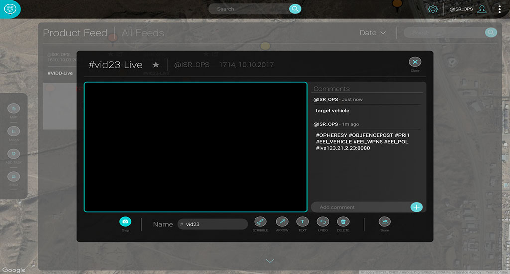 Using social media style interaction techniques (#tags and @handles), Metis users are able to instantly communicate ISR requirements as well as share finished intelligence products across the user community, drastically reducing data to decision timelines.